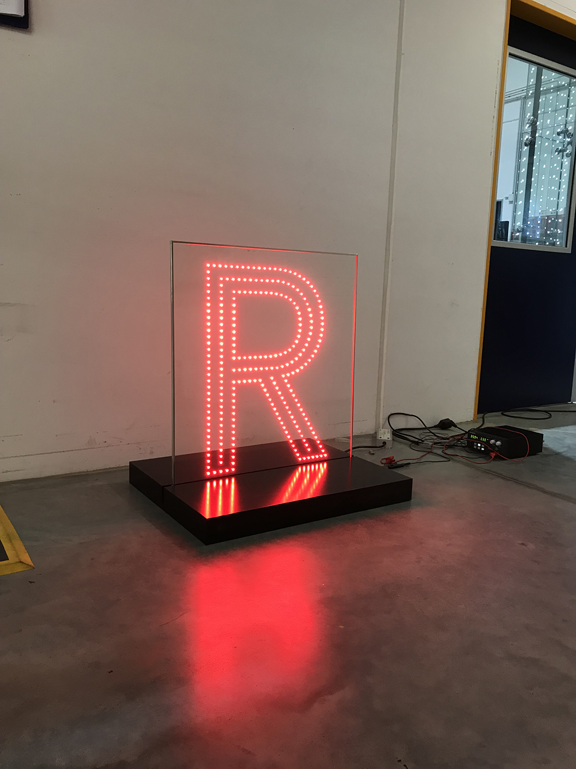 | Specification | 15 powerglass® elements with only one letter per panel, dimmable. Used power sipply and dimmer: 1 pc. for 15 pcs. of powerglass® |